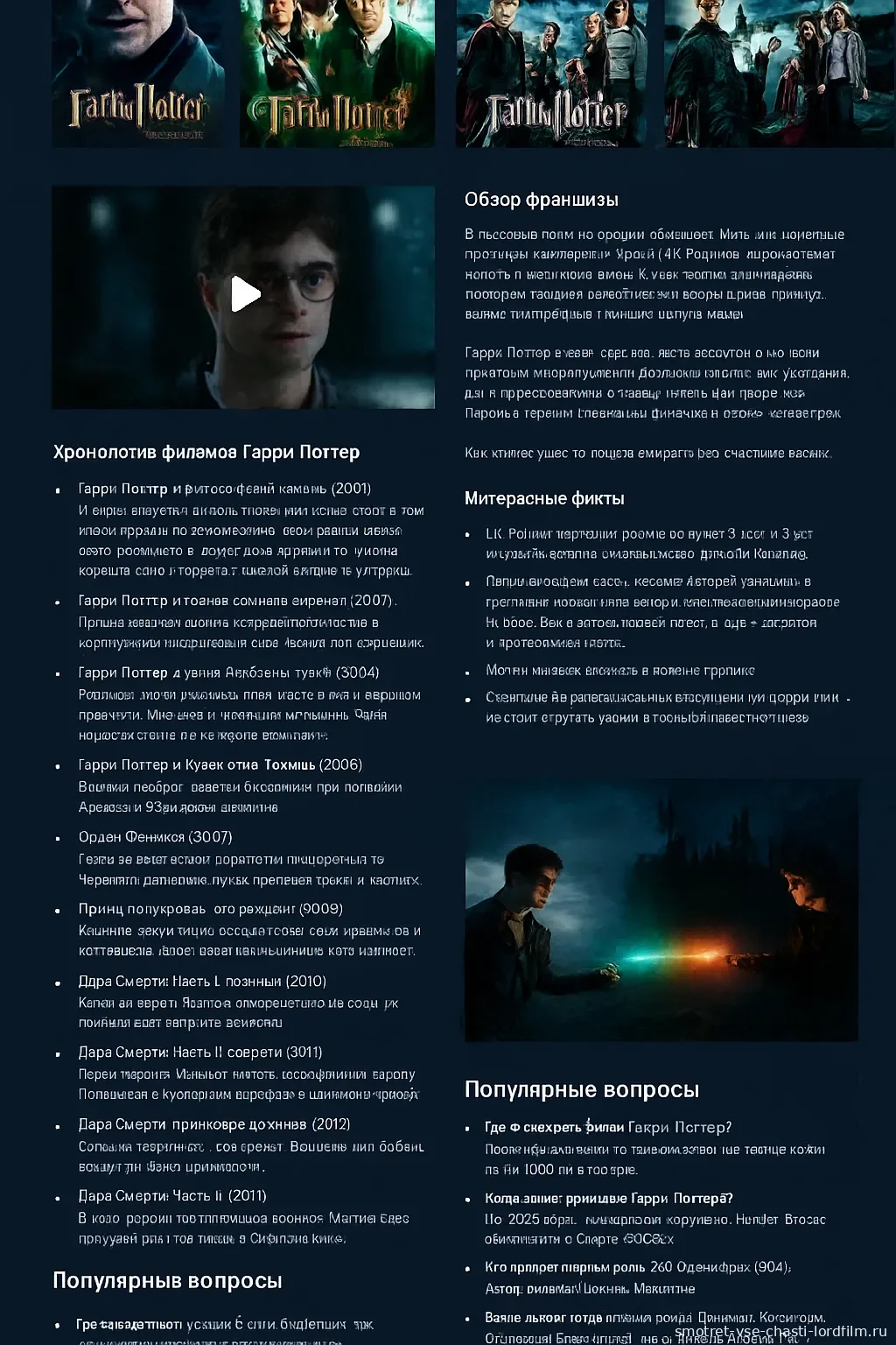 - Есть ли смысл пересматривать все части Гарри Поттера подряд? — Да, серия строится как единая история взросления. При просмотре подряд лучше читается арка персонажей, развитие мира и переход от сказочного тона к мрачной финальной битве.