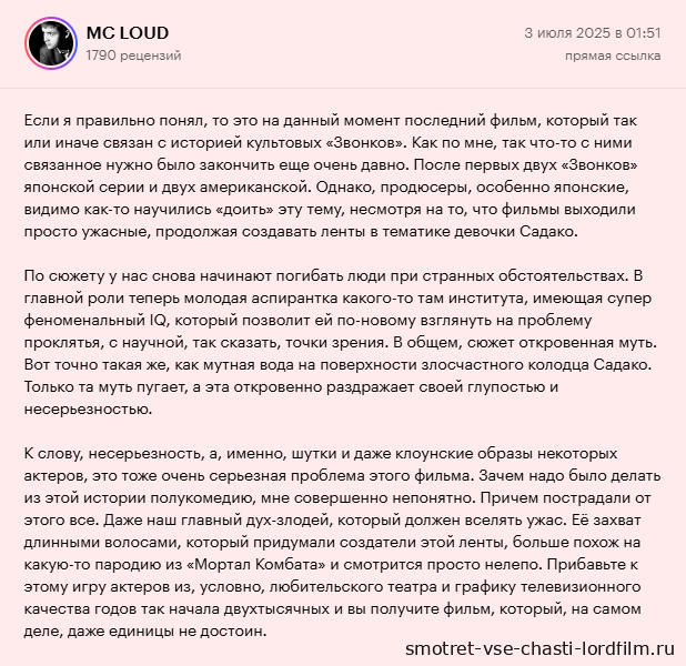 Франшиза «Звонок» давно стала легендой среди любителей хорроров. Ниже — реальные мнения зрителей, которые посмотрели все части по порядку: от японского «Ringu» до новых «Sadako DX». Делитесь своими впечатлениями и читайте, что думают другие фанаты!